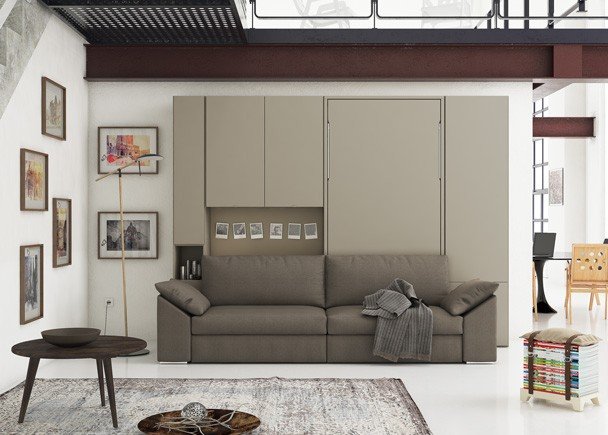 This composition with a vertical folding bed and storage space is built around the DIVO sofa , thanks to the two side wardrobes and the loft that joins the different pieces of the composition and unifies them.