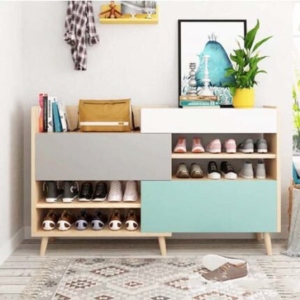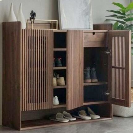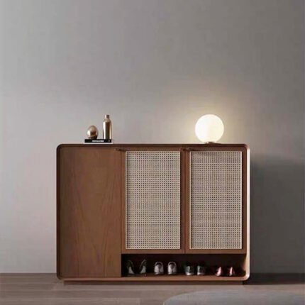 Since it has a bench, this shoe cabinet provides a place to sit while putting on or taking off shoes. The rattan doors add a textural element and may also allow for ventilation to help shoes air out