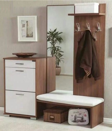 This is an upholstered shoe storage cabinet. Here?s a description: