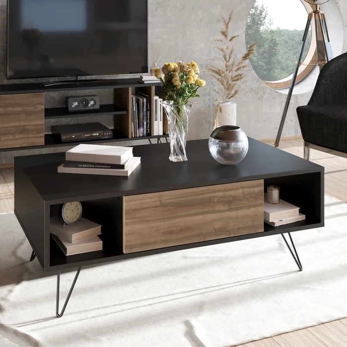 - The table features a convenient drawer, perfect for storing coasters, remote controls, or other small items.