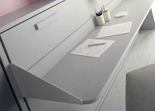 Rest and study, two in one in this folding bed with an integrated desk. And it also closes without slamming thanks to the addition of a third lift.