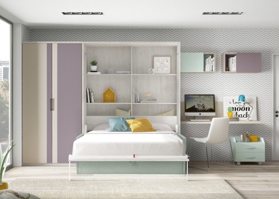 Youth room equipped with a folding bed model with sofa, a 2-door straight wardrobe and a study area.