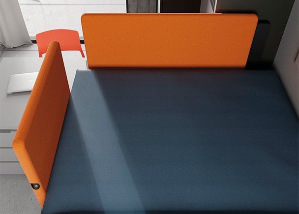 Youth bedroom with a horizontal folding bunk bed with a loft for a mattress measuring 90 x 190. The space is completed with a wardrobe with 2 swing doors and a study area designed as a peninsula, as an extension of the central shelf.