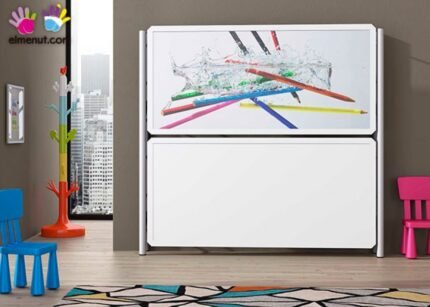 Children’s room with horizontal folding bed with folding desk.